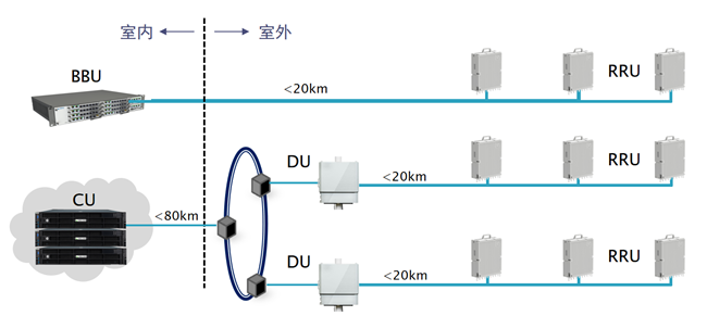 CU-DU可集中或分離部署,更適合分布式部署場(chǎng)景。CU集中部署,配合室外型DU,更適合于長(zhǎng)大隧道等特殊場(chǎng)景覆蓋。